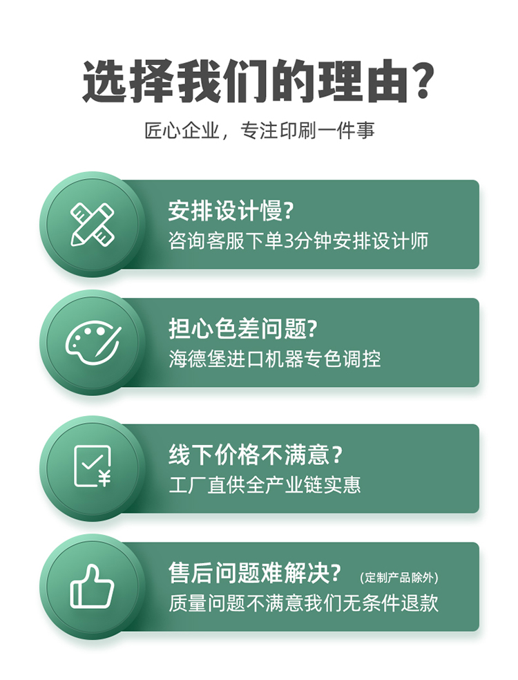 我们承诺,如果有质量问题,将由我们承担包含运费在内的退换货或重印费,不需要您承担任何风险。